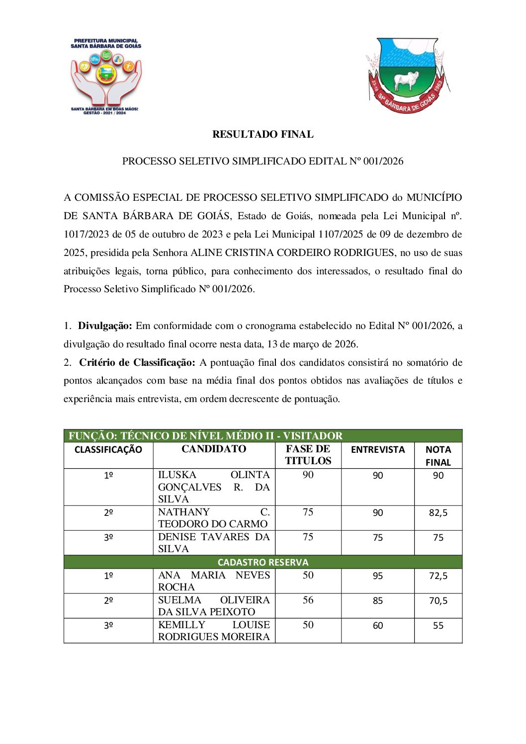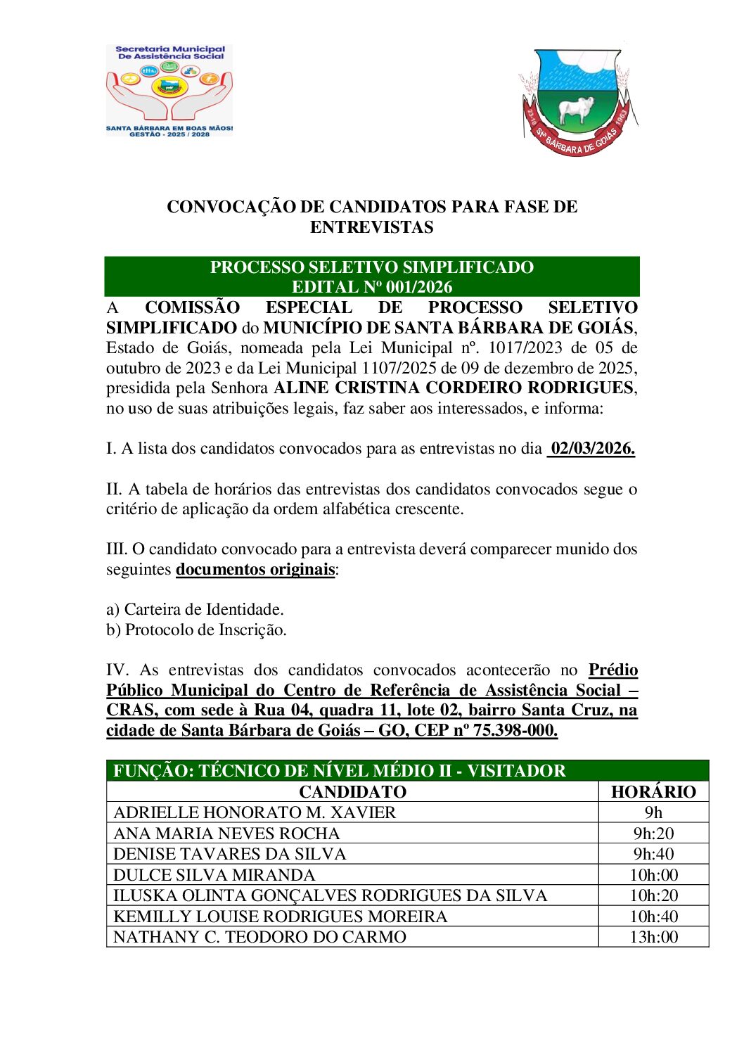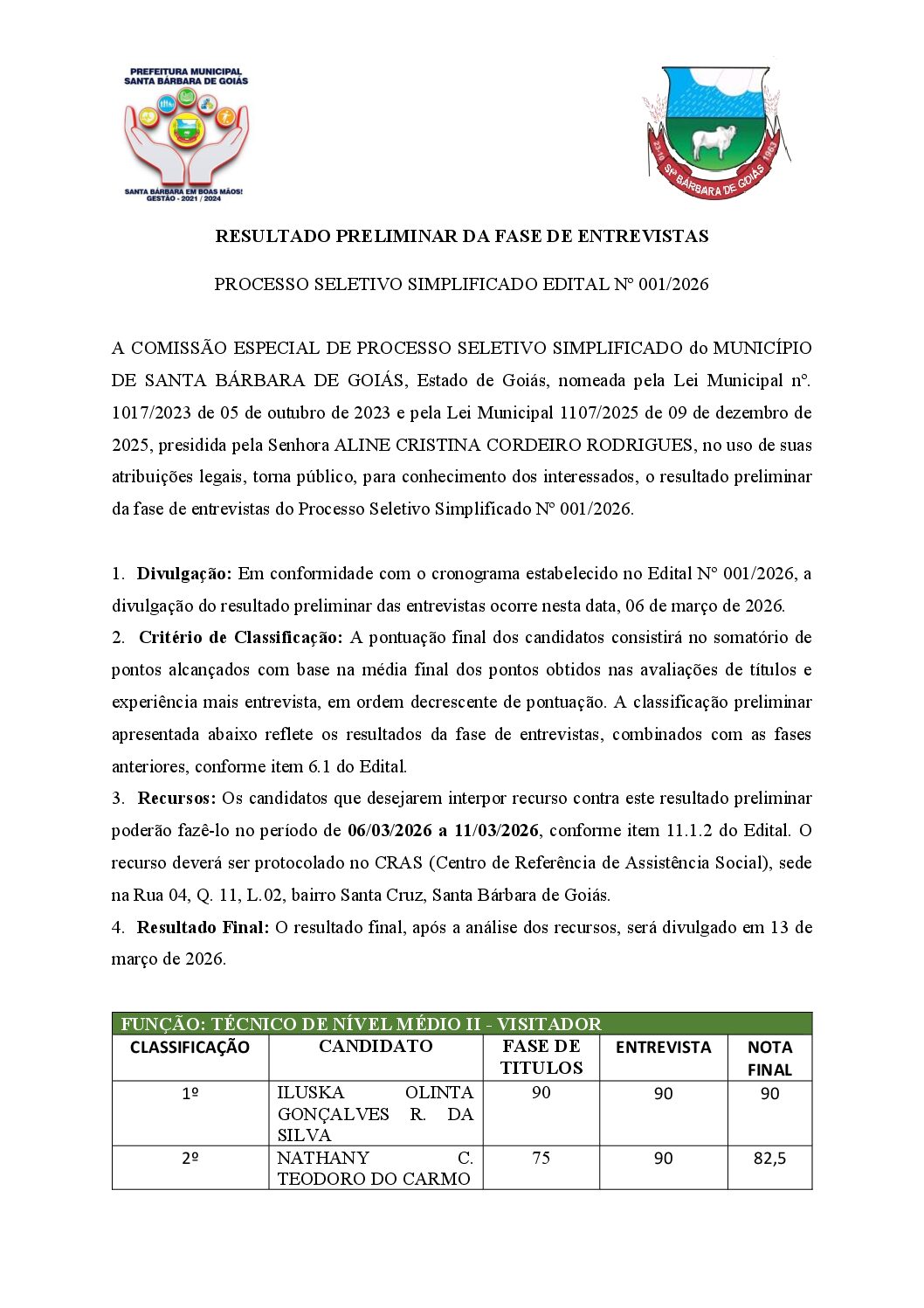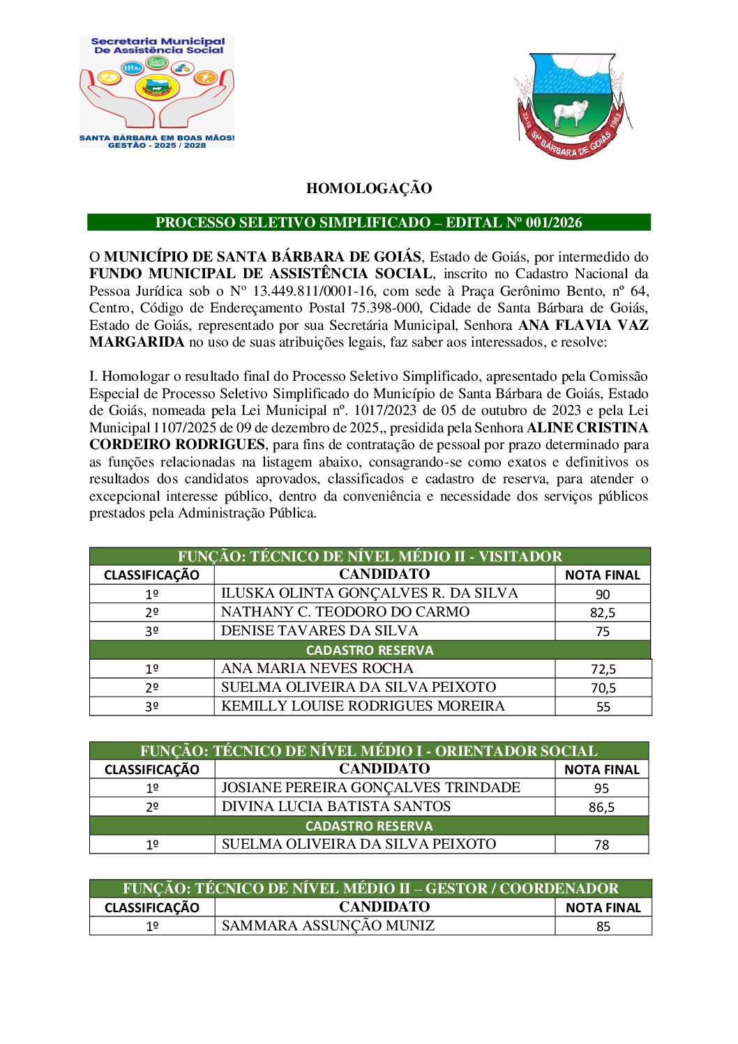 HOMOLOGAÇÃO DO RESULTADO FINAL DO PROCESSO SELETIVO SIMPLIFICADO, DO FUNDO... RESULTADO FINAL DO PROCESSO SELETIVO SIMPLIFICADO, EDITAL N°001/2026 RESULTADO PRELIMINAR DA FASE DE ENTREVISTAS DO PROCESSO SELETIVO Nº001/2026 CONVOCAÇÃO DE CANDIDATOS PARA FASE DE ENTREVISTAS DO PROCESSO SELETIVO...